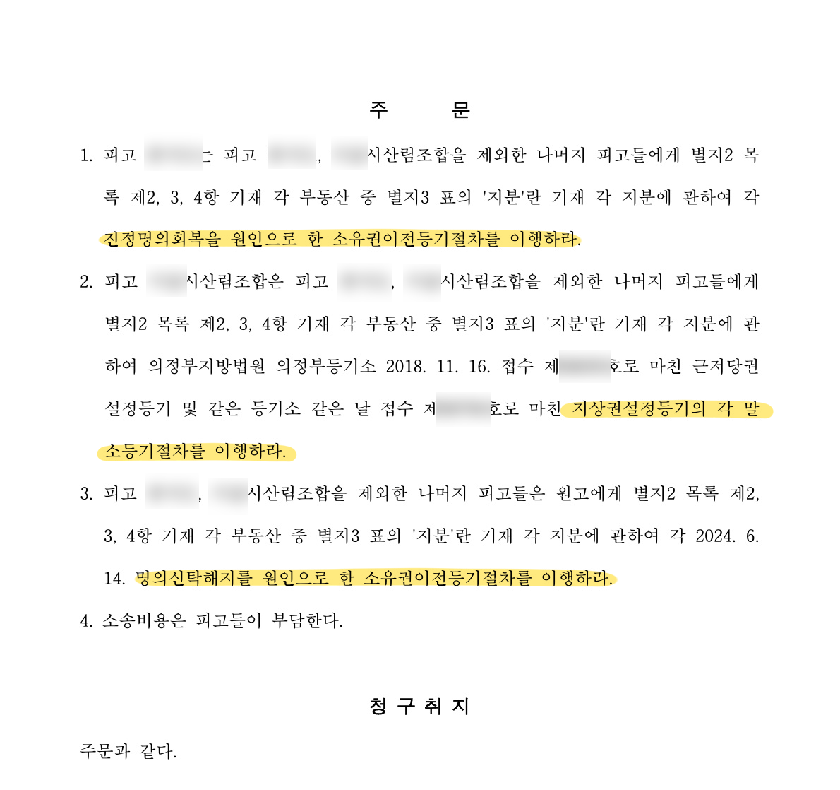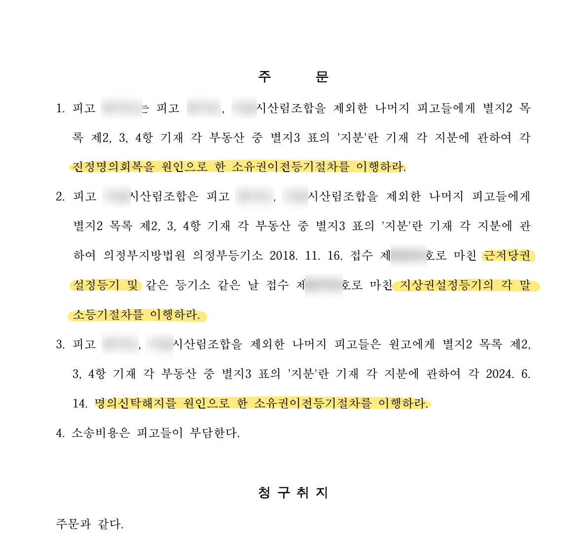 ◈ 원고(종중) 승소 판결 → 토지 소유권 회복 및 근저당권 말소 성공