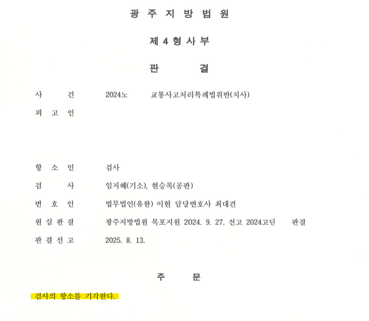 1심에 이어 항소심에서도 무죄 판결을 받음으로써, 의뢰인께서는 교통사고처리특례법위반(치사)이라는 중대한 혐의로부터 완전히 벗어날 수 있었습니다.