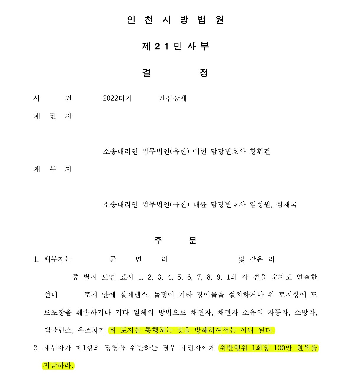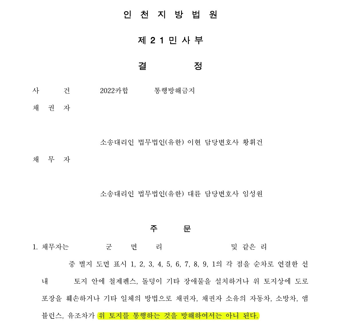 인천지방법원은 의뢰인의 주장을 전면 인용하여 통행방해금지 가처분 결정을 내렸습니다.