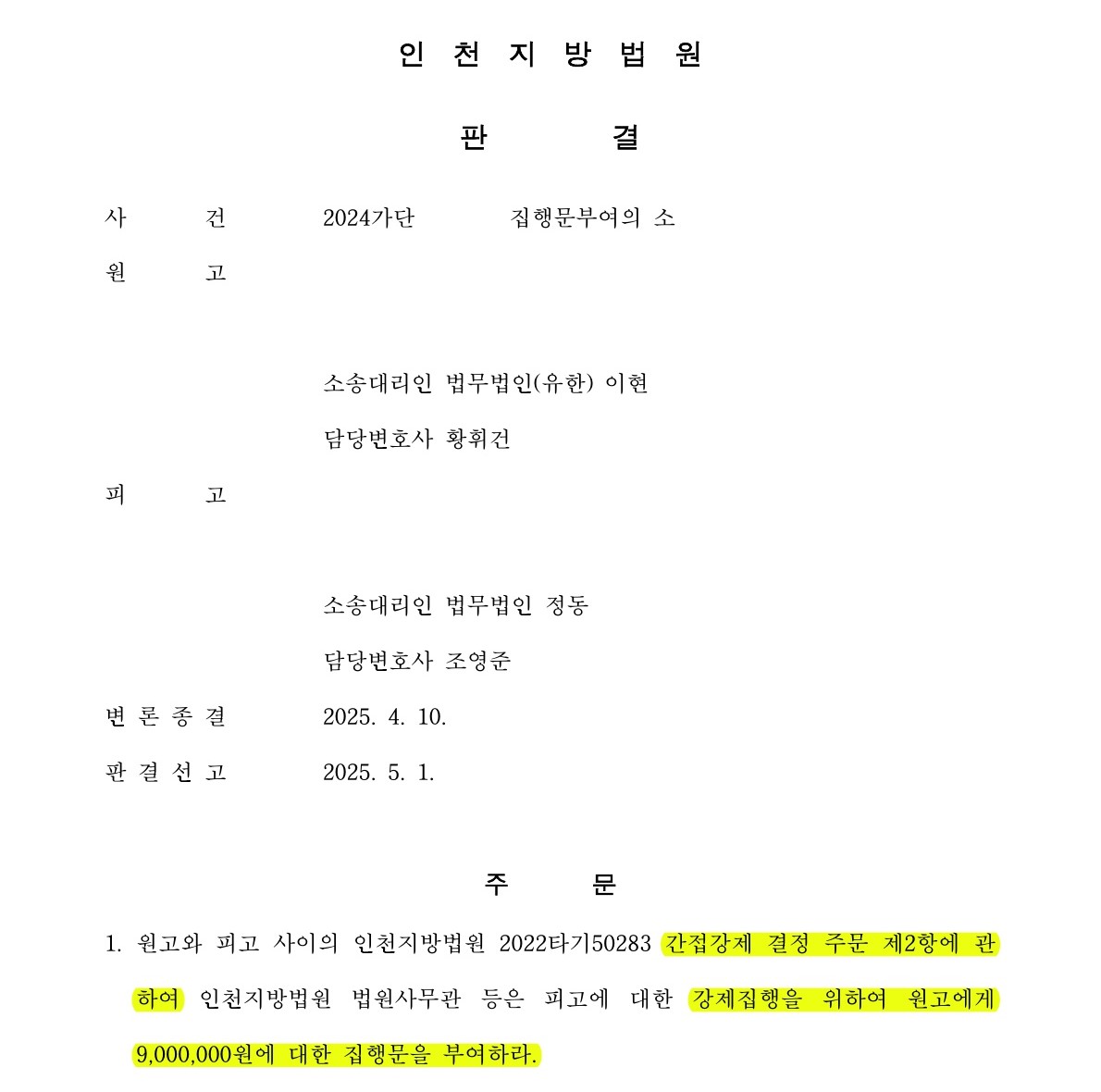 판결 확정 후 상대방은 간접강제금 900만 원을 지급하였으며, 의뢰인께서 깊은 감사의 뜻을 전하신 사례입니다.