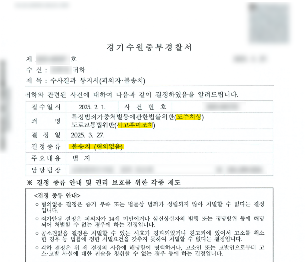 ◈ 철저한 법리 주장과 양형 자료 소명으로 → 특정범죄가중처벌등에관한법률위반(도주치상) 등 불송치 (혐의없음) 결정