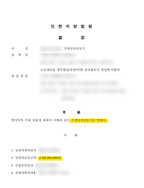 체계적인 정리와 적극적인 법리 주장에 따라, 약 2주 후 인천지방법원은 주택임차권등기명령을 인용하는 결정을 내렸습니다.
