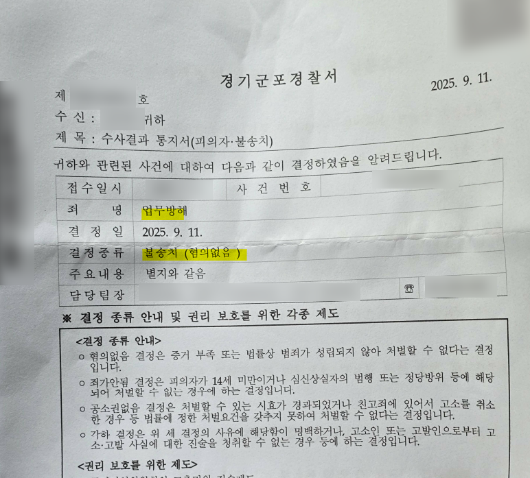 ◈ 경기군포경찰서, 피고소인에 대하여 '불송치 (혐의없음)' 결정 → 사건 신속 종결