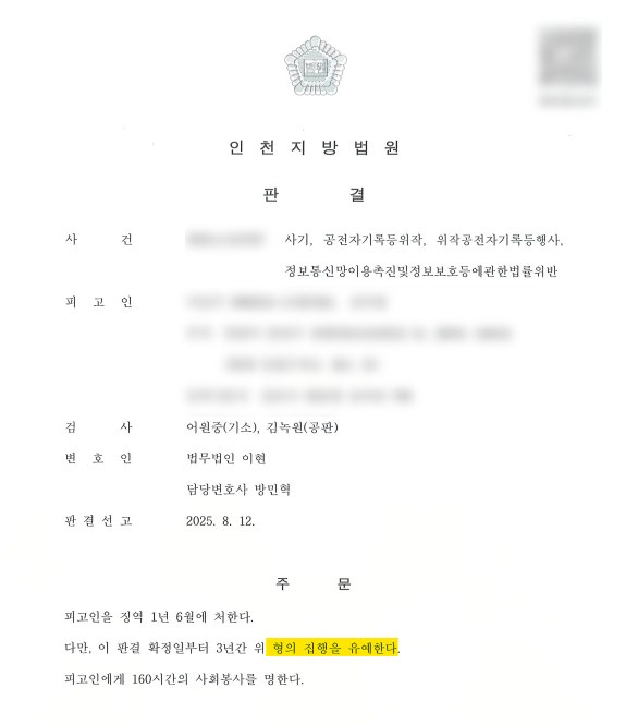 ◈ 인천지방법원 → 징역 1년 6월, 집행유예 3년 선고