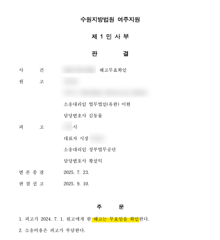 수원지방법원 여주지원은 해고 처분이 지나치게 가혹하여 징계재량권의 범위를 벗어난 것으로서 해고 처분이 무효라고 판단하며 의뢰인 승소 판결을 내렸습니다.