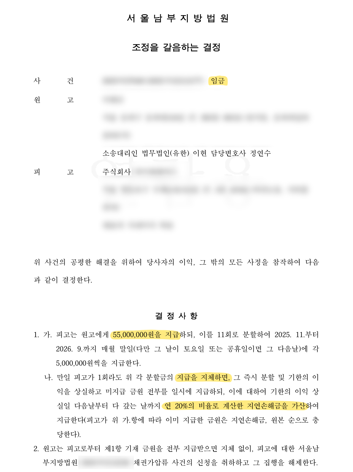 ◈ 서울남부지방법원 - 청구 금액 전액에 준하는 5,500만 원 지급 결정 → 성공적인 조정 성립
