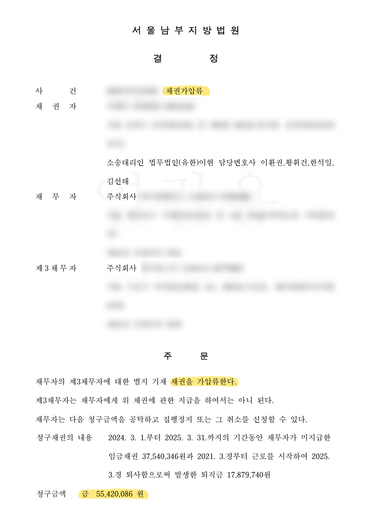 법무법인 이현의 노동 전담 변호사팀은 의뢰인의 채권을 보전하는 것이 무엇보다 시급하다고 판단했습니다.