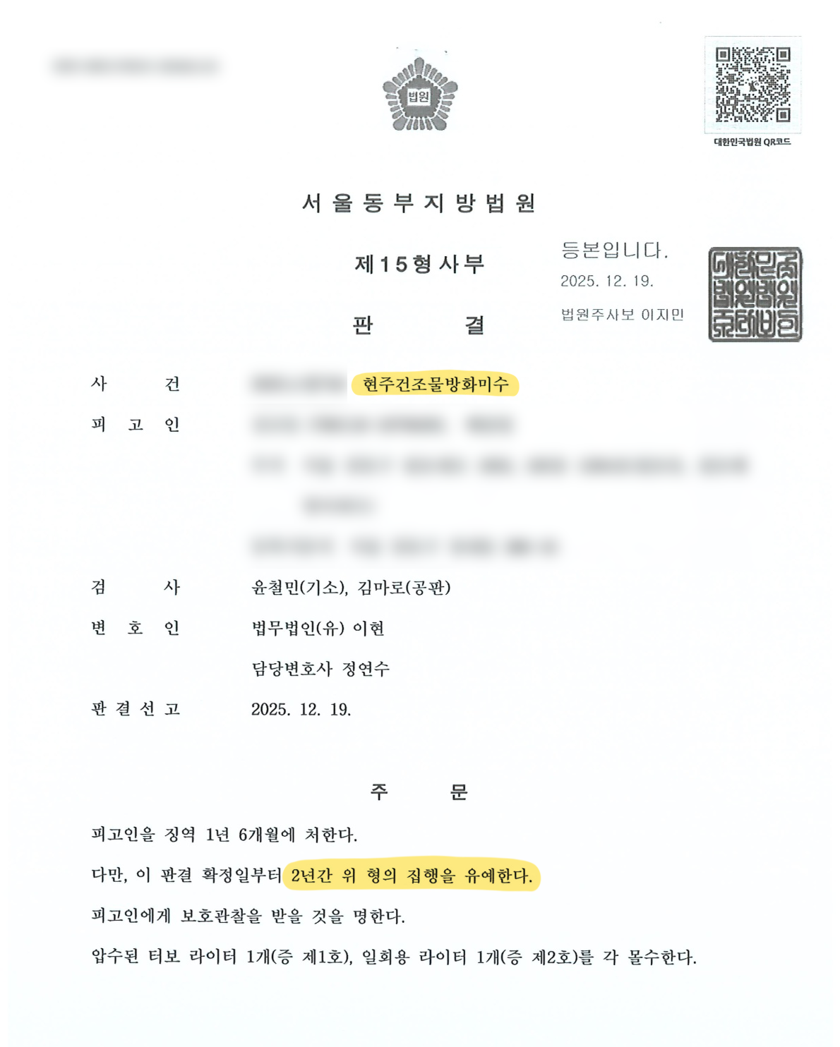 현주건조물방화죄는 법정형이 무겁고 사회적 위험성이 커 실형 선고 가능성이 매우 높은 상황이었기에,