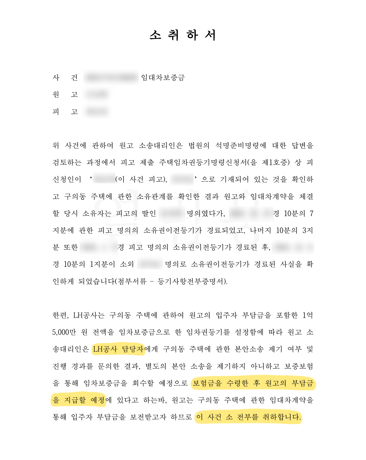 ◈ 보증보험을 통한 채무 해결 및 보증금 보전 성공 → 소 취하로 사건 종결