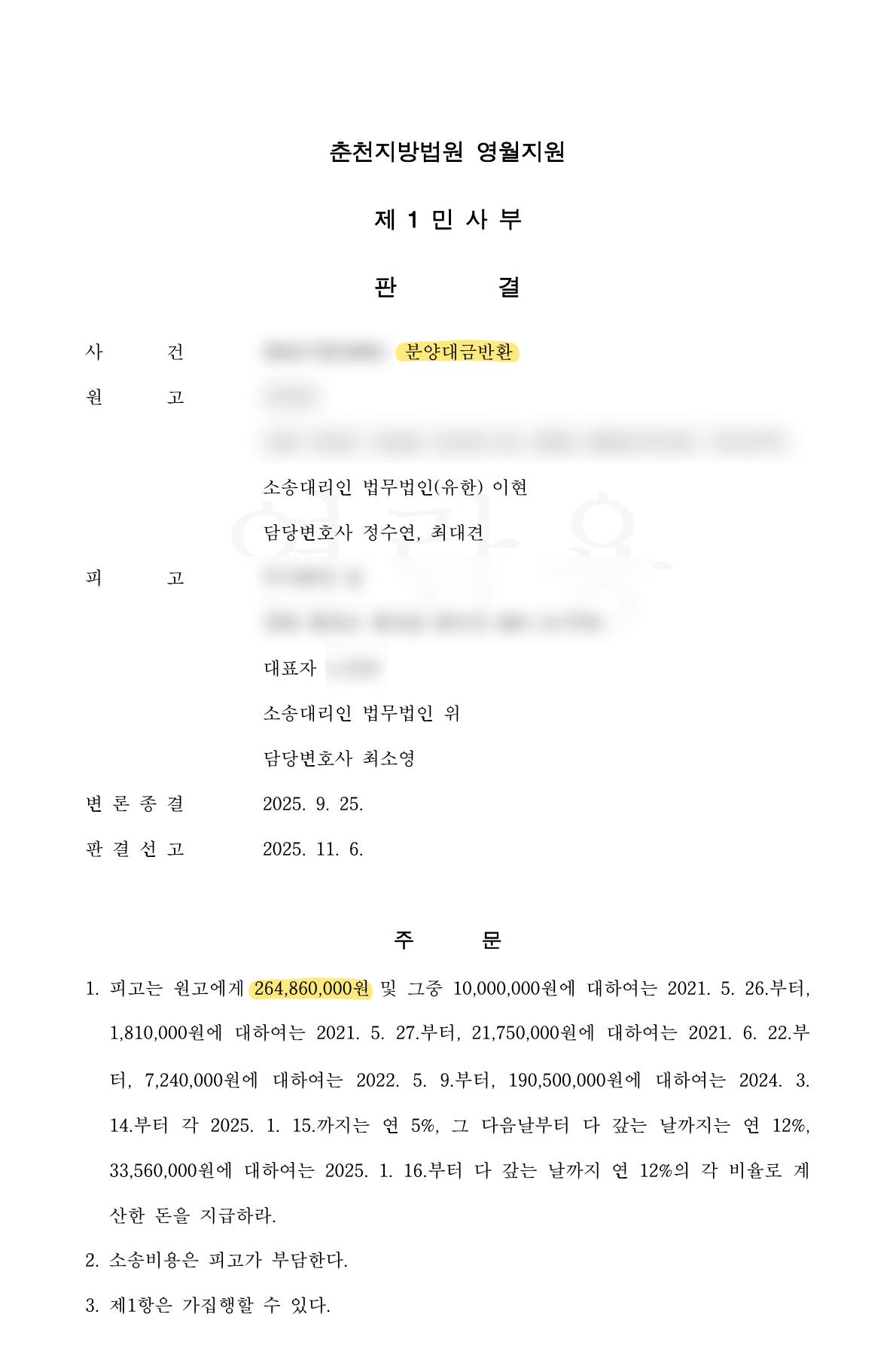 이 판결을 통해 의뢰인은 납부한 분양대금 전액은 물론, 33,560,000원의 위약금 청구까지 모두 인정받을 수 있었습니다.