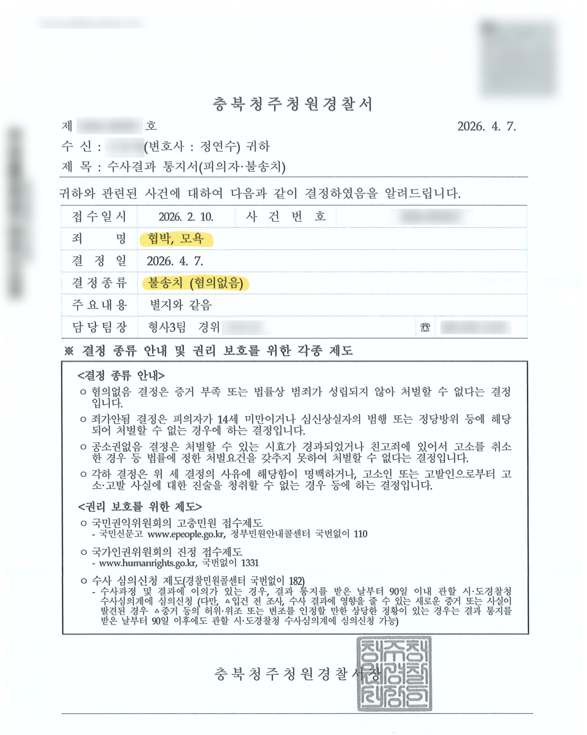 수사기관인 충북청주청원경찰서는 법무법인 이현의 주장을 적극적으로 수용하여 의뢰인의 협박 및 모욕 혐의에 대하여 불송치 결정을 내렸습니다.