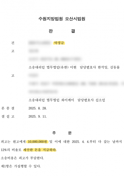 ◈ 대출 불가로 인한 계약 해제 요청에도, 계약금 반환을 거부당한 의뢰인 의뢰인은 2021년 7월경, 경기도 부천시 소재의 아파트 분양계약을 체결하였습니다. 당시 총 분양대금은 3억 5,500만 원이었으며, 의뢰인은 계약금으로 3,550만 원을 지급하고 중도금 2억 8,400만 원은 대출(융자)을 받아 충당할 계획이었습니다. 계약 체결 당시, 의뢰인은 혹시 모를 대출 부결 상황을 대비하여 분양계약서에 "매수인이 희망하는 대출금액 부결 시 지급받은 1, 2차 계약금을 조건 없이 반환한다"는 특약사항을 기재하였습니다. 단, 희망 융자금과 실제 실행 금액의 차이가 5% 이하일 경우에는 현금으로 대체하여 계약을 진행하기로 약정하였습니다. 그러나 정부의 대출 규제 정책 변경 등으로 인해 의뢰인이 당초 희망했던 제1금융권 대출이 불가능해졌고, 제2금융권을 통해 확보 가능한 금액도 희망 액수에 미치지 못하는 상황이 발생했습니다. 이에 의뢰인은 특약에 근거하여 계약 해제 및 계약금 반환을 요청했으나, 상대방(시행사) 측은 "신탁회사를 통한 담보대출은 가능하다"거나 "단순 변심에 의한 계약 파기"라고 주장하며 반환을 거부하였습니다. 명확한 특약이 있음에도 불구하고 수천만 원의 계약금을 돌려받지 못할 위기에 처한 의뢰인은, 정당한 권리를 찾기 위해 법무법인 이현을 찾아주셨습니다.