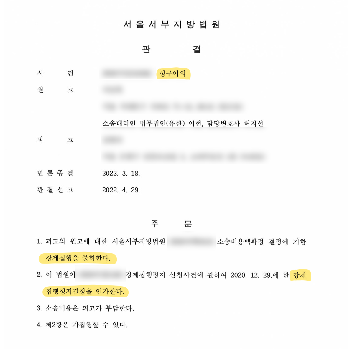 의뢰인이 지급해야 할 소액의 소송비용에 대해서는 즉각적인 강제집행(채권압류 및 추심명령)을 시도했습니다.
