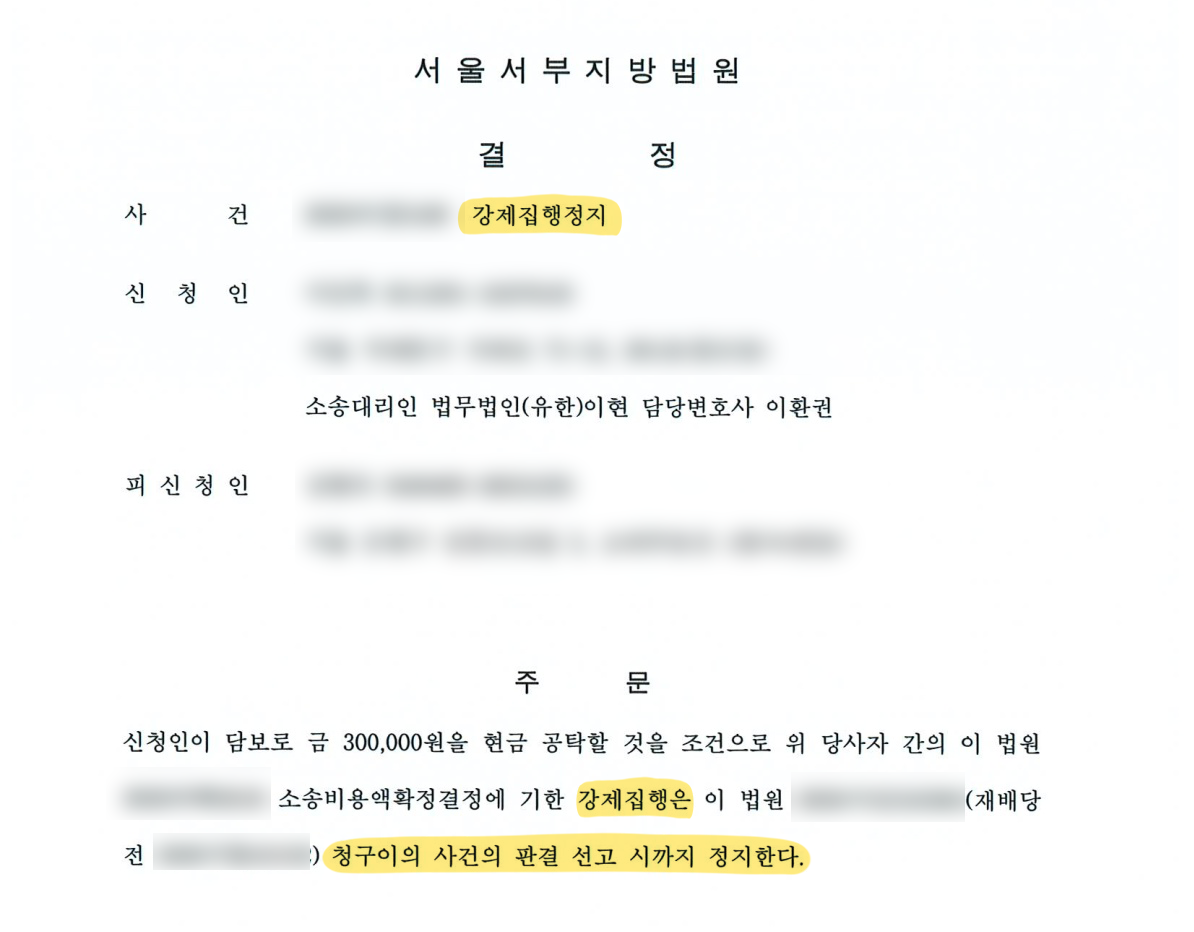 강제집행정지 신청(민사집행법 제46조)을 하여 인용 결정을 받아냈습니다.