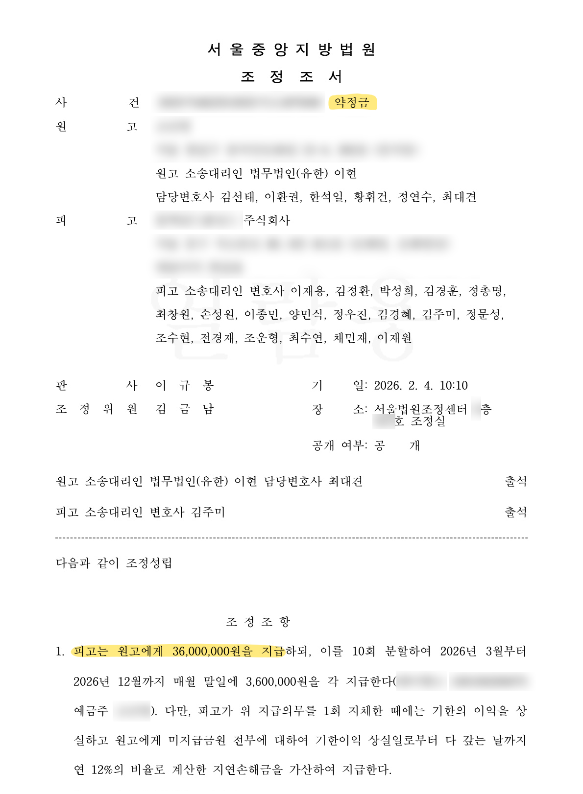 서울중앙지방법원은 본 사건에 대해 36,000,000원을 지급하라는 조정을 내렸습니다.